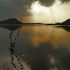 Sun set near a reservoir with hill background golden evening light